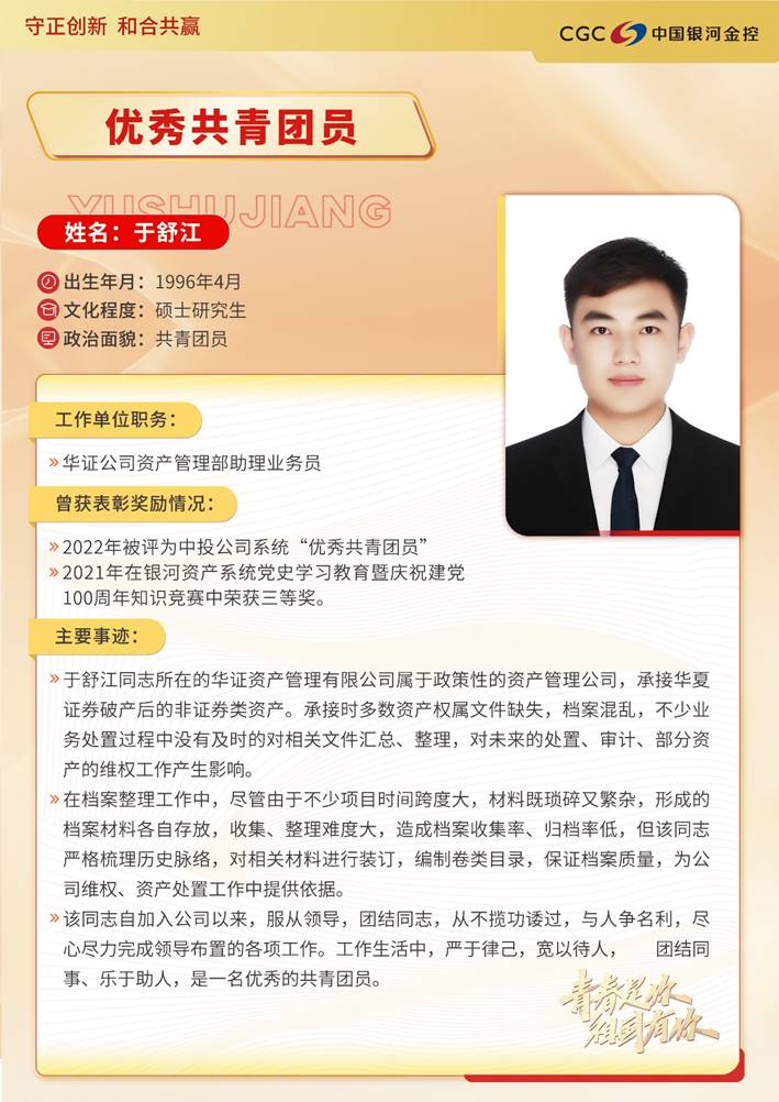 于舒江同志所在的华证资产管理有限公司成立于1999年,担负政策性资产处置任务,承接了华夏证券破产后的非证券类资产。多年来,华证资产始终坚持党的领导,较好的完成了政策性资产处置工作。